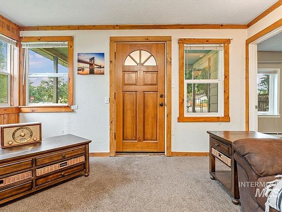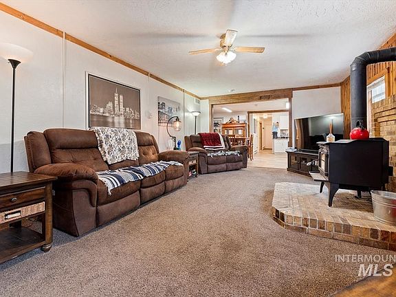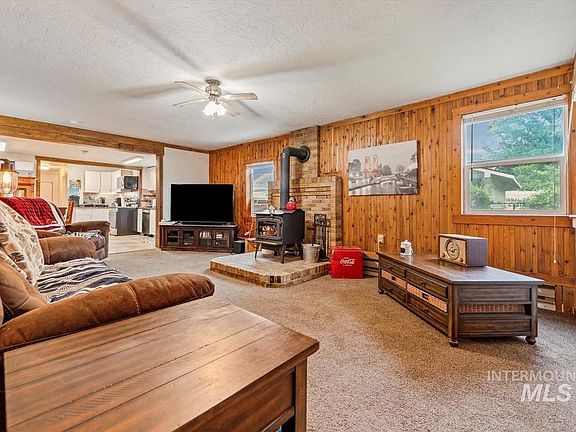 This unique single-level home is full of character. Picture a quiet morning as sunlight filters through the mature trees that grace the fenced property. A stone border lines the front walkway, inviting you to step onto the covered porch with a ceiling fan - a perfect spot to enjoy your favorite book or watch the world go by. Inside, wood panel accent walls and a wood stove fireplace add a touch of warmth and coziness. The open layout effortlessly connects the living, dining, and kitchen areas, creating a perfect space for everyday living. With the microwave, oven/range freestanding, and refrigerator, meal preparation is a breeze, and the windows over the kitchen sink bring the outdoors inside. Wood and vinyl/laminate flooring are easy to maintain, and the den/office provides a private space for work or creativity. The detached garage offers ample space for your vehicles and storage needs, while the R.V. parking and shop with electricity cater to your hobbies and adventures. Convenient alley access too.