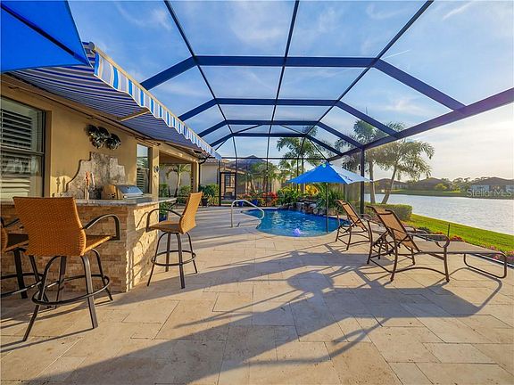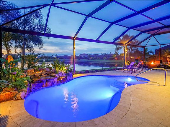Take advantage of this spectacular home offered at a very generous price! This rarely available Raphael Model is located in the beautiful gated River Strand Arthur Hills Designed Golf Course Community. Every attention to detail has been completed with over $160,000 in improvements! You and your guests will enjoy the over-sized, enclosed lanai with travertine deck, pool, & lighted waterfall, custom outdoor kitchen/bar with kegerator and sink, grill, and retractable awning with LED lighting. Extensive tropical landscaping including sidewalk to rear lanai, and outdoor up-lighting, paved brick driveway, and a garage just for your golf cart. The interior boasts an open floor plan with separate formal living room and dining room with custom trim. Open kitchen and family room with custom built-in serving bar with lighted cabinet and wine refrigerator have been added for indoor entertainment. Master en-suite with views of the pool, waterfall, and lake, custom walk-in closet organizer, bath with double sinks, soaker tub, and walk-in shower. All rooms include custom plantation shutters, ceiling fans, upgraded lighting, crown molding & custom baseboards. Your Social Membership includes the use of 2 health clubs, 2 community pools, spas, 6 satellite pools, tiki bar, two club houses, restaurant, year round activities, billiard room, pickle ball courts, and tennis courts. So much to do that you never want to leave! Easily accessible to new Costco, shopping, I-75, and schools. So much to list, you will just have to come and see for yourself! Motivated Seller!