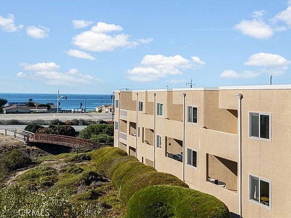 Experience coastal living at its finest with this impeccably maintained 2 bedroom, 2 bathroom condo in the desirable complex located just a leisurely stroll away from the Morro Strand State Beach. This move-in ready corner unit is the largest in the complex and offers ocean views from both levels. The home features a spacious open floor plan bathed in natural light, creating a warm and inviting atmosphere. The well-appointed kitchen is situated open to the living and dining areas and features plenty of counter space and a convenient breakfast bar. The great room opens to a balcony with sweeping views of the coastline. Second story primary bedroom also offers a private ocean view balcony where relaxing evenings with beautiful sunsets can be enjoyed. The unit has been updated with newer flooring, baseboards, stair railing, plumbing and fixtures.The unit also includes a 2 car carport and large enclosed storage space on the bottom level. The Bay Creek condo complex is very well cared for with roof, deck coatings, and windows/sliders updated throughout. Whether you seek a place to permanently call home or a part time coastal retreat, this is a wonderful place to make your own!