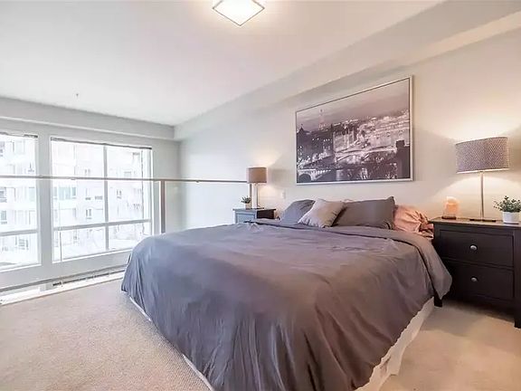 This trendy 2 level clean 1 bdrm & den LOFT condo features 18 ceilings and oversized windows on the quiet side of complex! Spacious Master suite upstairs with laundry for added convenience. Laminate floors in kitchen, stainless steel appliances & powder on main floor for company. Door leads to spacious deck perfect for entertaining