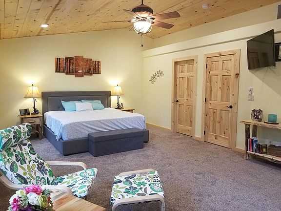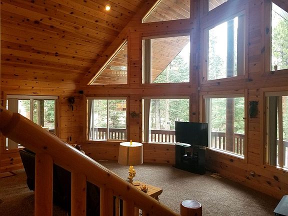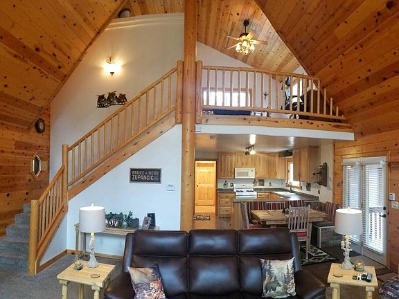 Located on a .8 ac lot at the end of a cul-de-sac in the hidden subdivision is this 2052 sq ft 3 bed 3 bath cabin. Easy access into the cabin is by 2 steps. The open floor plan includes a prow window front looking into the pine tree forest. The living room is finished with T&G interior walls, vaulted ceiling, wood stove & stairway. The kitchen has hickory cabinets, tile flooring, dishwasher, gas stove, microwave & fridge. There is a laundry/mechanical room with a forced air furnace & water softener. The large master bed/bath suite are located on the main floor along with a second bedroom & bath. The upper loft is a second master bed/bath suite. The Cabin sits on a 4 ft cement crawl space finished with rock floor which is excellent to store a 1100 gal extra water storage tank, vegetables &