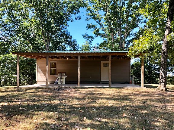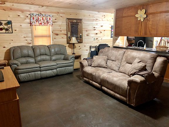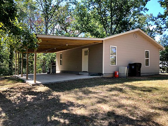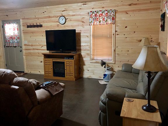 Cozy two bedroom starter home or peaceful weekend getaway. Cabin style interior and vinyl siding exterior on 1.8 acres. The house is built on a concrete slab that is grouted and stained giving it the look of ceramic tile throughout. It has central heating and air.