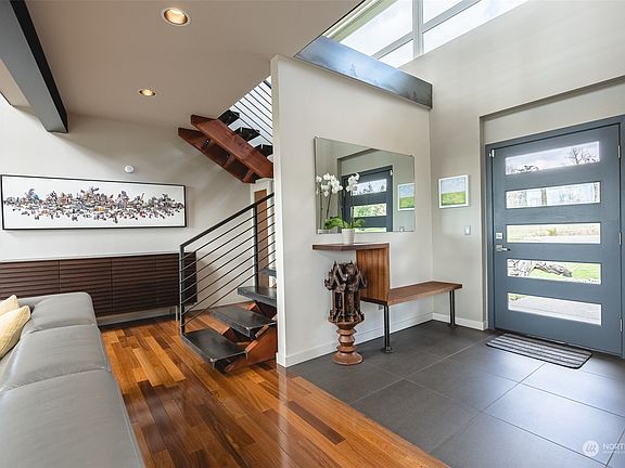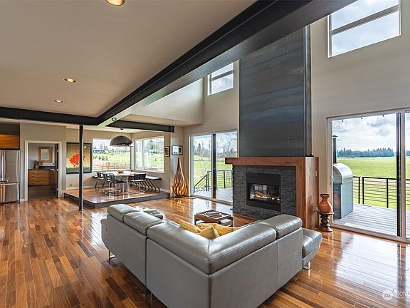 Custom, high-end home with architectural details and elevated finishes only 16 min north of Bellingham. Bask in natural light from feature windows w/ auto shades with island and mountain vistas. Be captivated by surrounding nature and stunning sunrises and sunsets. This home was methodically built with no expense spared; including Brazilian teak floors, RO filtration, ozone air purifier. Spa-like lux primary suite. Modern kitchen with Bosch appliances, induction cooking, double oven and horizontal grain walnut cabinetry. Level 1 accommodates guests w/ private entrance. Covered deck, hard scaped patios, wood-fired oven, infrared bbq and beverage taps. Oversize garage, heated outdoor faucets, solar panels, orchard, vineyard, 2 AI Robo mowers.