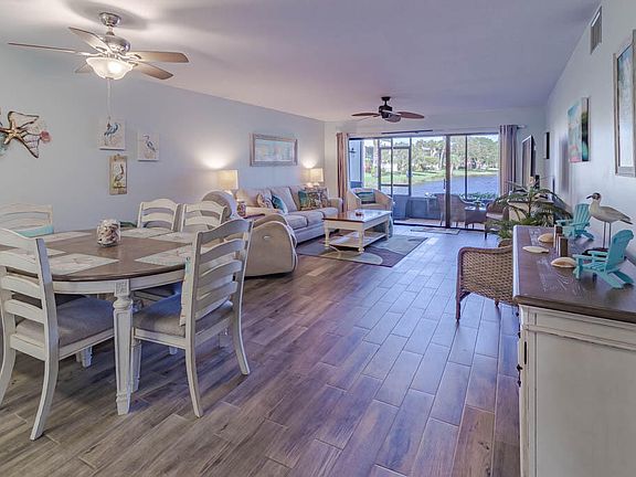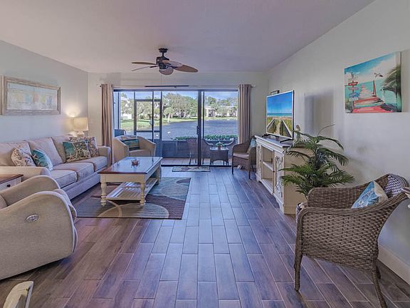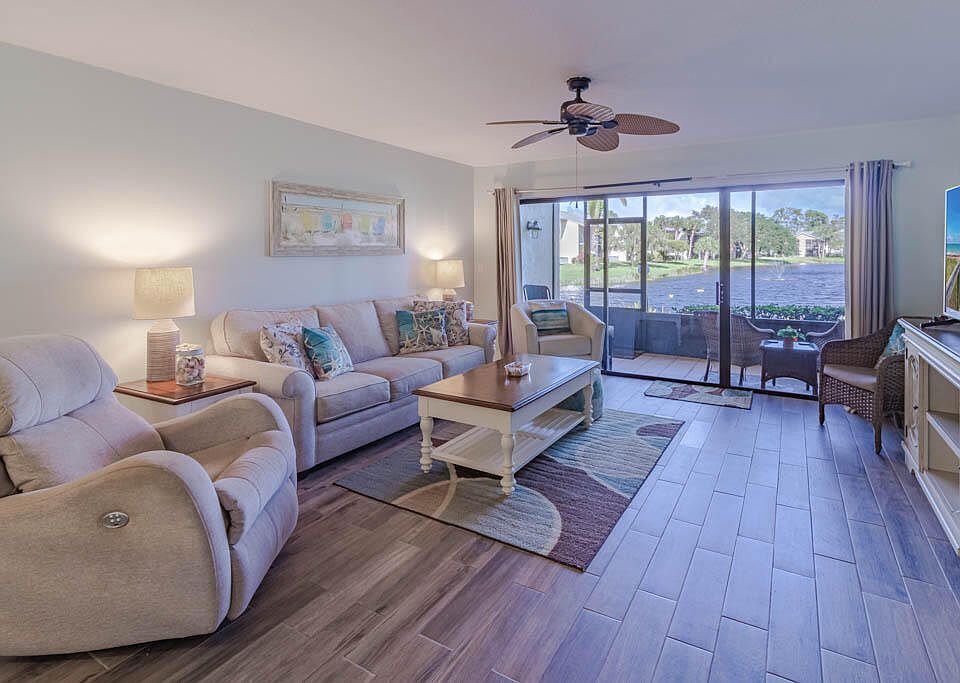 WELCOME HOME to your beautifully updated first-floor condo, offering serene, long lake views and a lifestyle full of sunshine and convenience. Step inside to discover a spacious open-concept floor plan, highlighted by a bright, inviting kitchen with newer cabinets, stone countertops, and modern appliances. Coastal-inspired wood-look floors flow seamlessly throughout, enhancing the airy, beachy ambiance. Enjoy your morning coffee or sunset on the spacious screened lanai, perfect for soaking in the natural setting. Equipped with hurricane shutters & covered parking, this condo ensures both style and safety. Located steps from the pristine clubhouse, a sparkling pool, and recently refinished tennis and pickleball courts, every day feels like a getaway. You'll find yourself minutes from scenic parks, beaches, shopping, dining, and theater in award-winning Downtown Stuart. This is more than a condo; it perfectly blends modern coastal charm and vibrant community living. See for yourself!