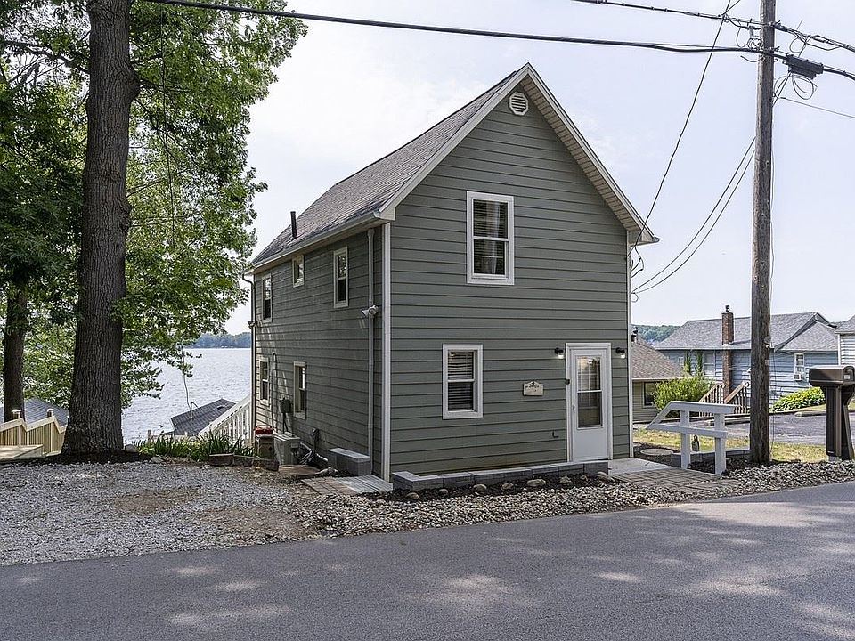 Lakefront home on Crooked Lake. The beach is sandy, the dock is included and the views are phenomenal! Two stories with three bedrooms, 1 bathroom and 960 finished sq ft. The main level is open concept with a large living room, slider to the lakeside deck and an updated kitchen with breakfast bar. All new kitchen appliances, white painted cabinetry with new hardware. All new flooring and fresh paint throughout the home. The kitchen appliances are included plus a stack washer/dryer on the main level. New roof in 2019, 2 new split units for heating/cooling in June 2020, new steps to the lake in June 2020 and new water heater 2017. 7' unfinished basement with entry under the deck. Also included is a back lot with 720 sq ft detached garage and lots of parking. The lakeside fire pit is a great place to gather, relax, entertain and enjoy the lake life. The 2 free standing cupboards and bar in the kitchen are included. All main level furniture, TV and sound system are negotiable.