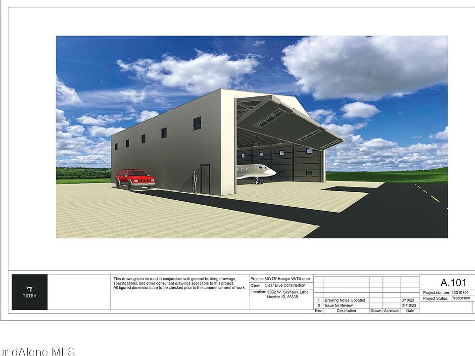 Great opportunity to own a custom, fully engineered, free span, all steel hangar at the CDA Airport. The building has been ordered and interior amenities are customizable! The site work is completed, with all utilities ready to be hooked up. The oversized lot allows the addition of a second income hangar of the same size, or finish it out and have your own ramp, heli pad, etc. The sky's the limit when looking at this opportunity! 80' wide X 75' deep; 24' eaves, 68' x 19' door with 18' clear space when open; lot dimensions are 220' wide X 120' deep. 6,000 sq. ft. hangar on taxiway D2 at the Coeur d'Alene Airport. Single piece hydraulic door system. For reference, the builder has a hangar for viewing. WA Trust has a program available for financing, if needed.