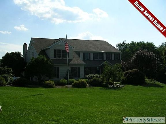 Set back from street on a long driveway, this spacious well maintained 2-story colonial has a wonderful covered front porch. The 2-story center hall, master bedroom and dining room have hardwood floors and 9' ceilings are throughout most of the home. Both the living room and dining room have chair rails and crown molding. The eat-in 28' kitchen boasts granite counters, glass tiled backsplash, Bosch dishwasher and overlooks the 2-story family room which is highlighted by a stone gas fireplace. French doors open to a gorgeous hardscaped patio and fire pit area, backstairs leads to a guest room or study, possibly in-law suite with full bath. The upper level includes master bedroom with sitting room. There are four additional bedrooms and 2 baths. All bathrooms have been updated with granite. Recent updates include 3 year old heating and central air and a new roof. Interior freshly painted. Finished lower level 45~~~x33~~~ family entertainment center has a gas stove and slider to yard. Solar panels on the back of the roof and a full home generator. This home is ready for its new owners!