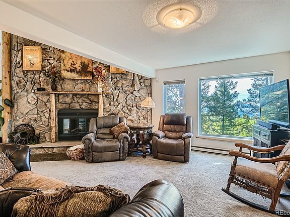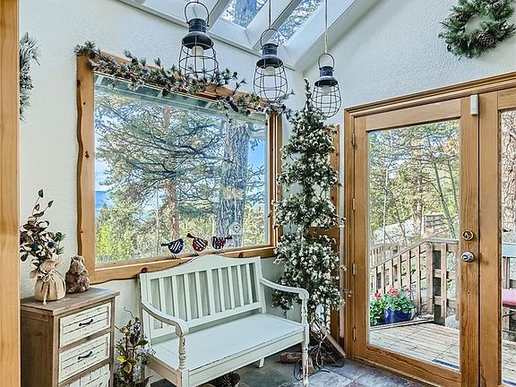 Stunning custom contemporary home with breathtaking top-of-the-world views and private guesthouse! This mountain haven boasts its own seasonal stream to relax and sit by with 3 separate decks and 360 views of the Rocky Mountains, including iconic Pikes Peak and Mt. Rosalie. Inside, you will be wowed by the warmth and beauty of the vaulted ceilings, log accents throughout, marble in kitchen and baths, 800 sq ft master suite with jetted tub, floor to ceiling fireplace in the the living room, walkout basement, fireplace with pellet stove in basement, and many windows for natural light. Upstairs, a loft overlooks the main living space giving you a bird’s eye view of the stunning mountain surroundings. Next you will find a 3 car garage with mother in law suite. Here you will find a kitchen, living room, two bedrooms and bonus room, and a 3/4 bathroom. Use this space as an office, guesthouse, or rental income. 2 separate street entrances. Located on a school bus route and 5 minutes from HWY 285, the main road is snow plowed and provides for an easy commute to the city, although once here, you won't want to leave!