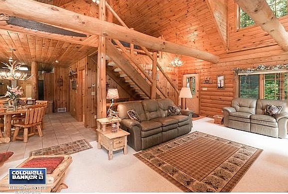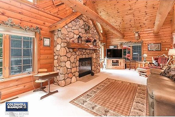 A beautiful drive through the woods leads you to this remarkable, completely private, custom log home built with extra solid concrete walls! 40 wooded acres provide abundant wildlife for the outdoor enthusiast. Inside the appealing open concept and copious storage make this home functional with a spacious feel. The great room has soaring cathedral ceilings, plenty of natural light, and an impressive stone, gas log fireplace. An open staircase leads to a loft that overlooks the great room and features hickory floors and space for an extra bed. The kitchen is fully appliance with a gas stove stovetop, wall oven, refrigerator, dishwasher, and disposal. The peninsula features seating for 2 and a stone façade. Ceramic floors cover the kitchen and dining area, and a rustic chandelier hovers above the dining table. Patio doors in the dining area lead to a large deck. The master suite has a full bathroom and walk in closet. Tongue & groove woodwork throughout and impressive views from every window make this cozy retreat irresistible! Guests will love attending parties in your impressive, quality built tiki hut. Even in the rain! The roof is completely water proof. Or, move over to the covered porch in the front of the house to watch a storm over breathtaking views of the pond. There is plenty of room for toys in the oversized garage that fits up to 4 cars! Additional attic storage above. Managed Forest Law, with plans to thin approximately 30 % of trees in the next year, buy soon and the new owners may receive the proceeds from the lumber! Outdoor wood burner provides all the heat you need, but LP gas furnace is available as well. New shingles July 2016 (complete tear off and replacement, 50 year transferrable warranty), new sump pump with battery backup January 2016, new garage door openers March 2016.The driveway is blacktop for easy snow removal in winter. Log furniture negotiable! No sign out front per seller's request. Square footage per seller. Licensee related to seller.