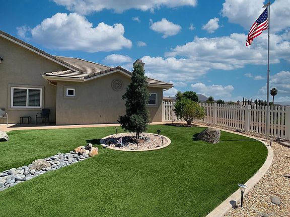 Enjoy spectacular mountain and valley views from this exceptional home, designed for luxury and low-maintenance living. The outdoor oasis features a BBQ island with refrigerator, pizza oven, glass firepit, 4-burner cooktop, rotisserie, and sink with hot water. A negative edge pool with spa, putting green, and garden area complete the backyard retreat. Inside, hickory wood floors and wood cabinetry elevate the kitchen, which includes granite counters, a convection oven, and an induction cooktop. Additional features include dual-pane windows, central vacuum, a tankless water heater, and solar panels. The two-car garage offers a pass-through garage door to the backyard and a water softener. With a 10,000 gallon steel water tank, the well water keeps water bills at bay. RV parking onsite with a dump-out! Built for strength and style, this home offers a perfect blend of elegance and practicality.
