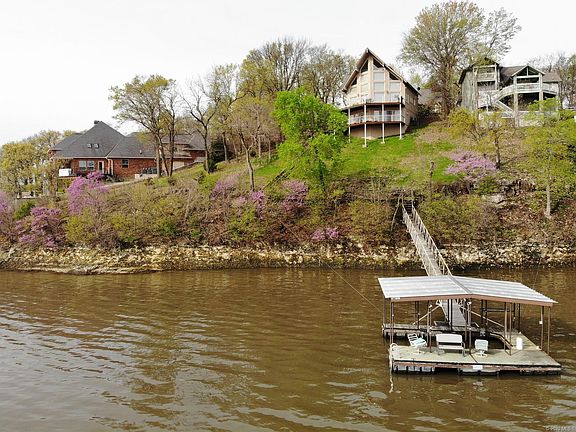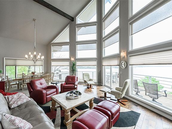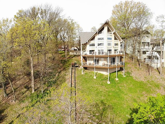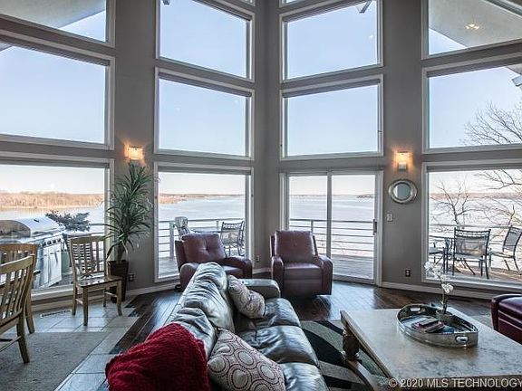 VIEW is magnificent! Nearly 180 view of 100' of Grand Lake Shoreline seen from the Great Room floor-to-ceiling windows 2nd floor East facing Loft. 5 bedrooms & 3 full Baths Chef's Kitchen granite counters & stnls appliances opens to Dining/Great Room combo Hardwood floors throughout tiled Kitchen & bathrooms Master Bed fireplace, whirlpool bath, dressing room, deck access 1100 sq ft wraparound deck, electric tram down to 1-slip covered boat dock Detached garage has separate room for office w/heat & A/C!