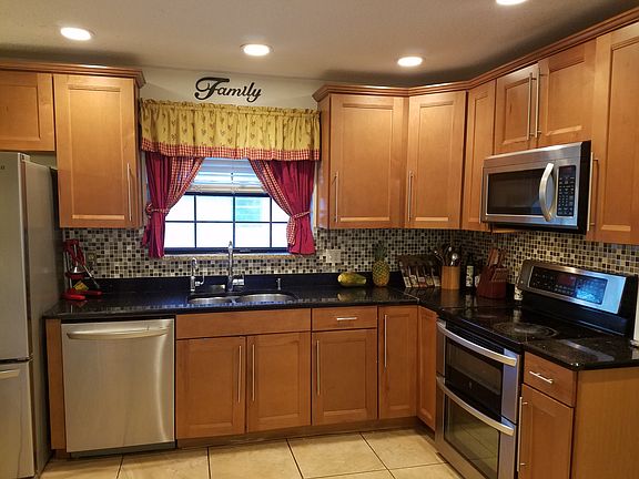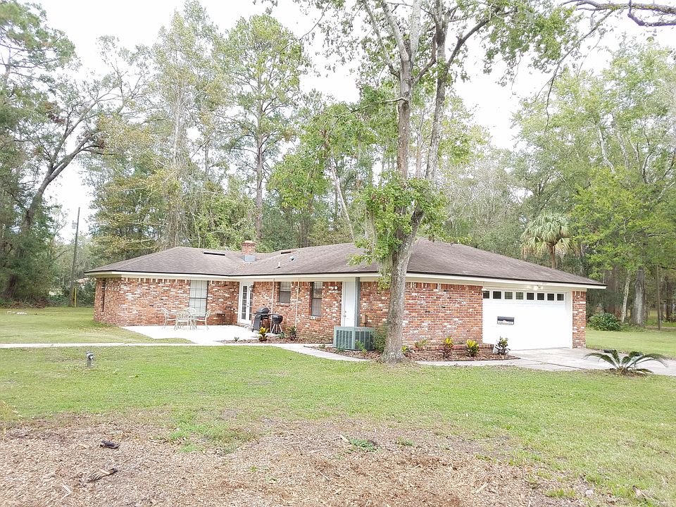 Country living with land! This 3/2 brick home is nestled on nearly 2.25 acres of land and only minutes from restaurants & shopping! In the kitchen you will find newer cabinets, granite countertops, tiled backsplash and ss appliances. The master has two closets, large shower and plenty of natural light. Other highlights: plank tile flooring, dining room, family room, updated bath, laundry room with washer & dryer and wood burning fireplace. Step outside and enjoy the large patio, creek for fishing, large garage/workshop, chicken coop with chickens, treehouse and more! Kids can walk to school! Home warranty included! With easy access to the toll road, St. Vincent's medical center & many amenities of the Plantation Crossing shopping center make this the perfect place to call home!