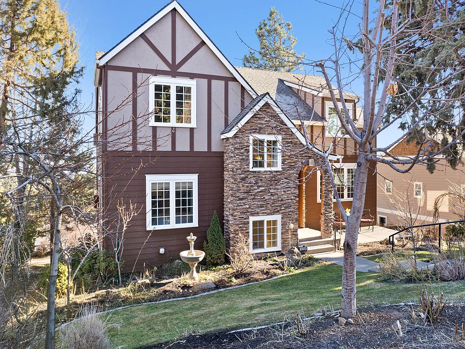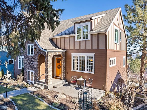 Awbrey Village Tudor home with gorgeous Northeasterly VIEWS! The open great room with a gas fireplace and a cozy dining area opens to a large deck perfect for enjoying the morning sunrises and evening city lights. The Kitchen has a large island, granite counters, cherry cabinets, stainless steel appliances, built-in refrigerator, pantry, built-in desk and a dumbwaiter from garage. The main level includes a formal dining room and 4th bedroom/office with French doors and access to a full bath. Upstairs there are 2 guest rooms and a primary suite with views, gas fireplace, walk-in closet, bath with jetted tub and cultured marble shower. Features include hardwood and tile floors throughout (NO CARPET), built-in speakers, central vac, Hunter Douglas blinds and AC. Huge alley entrance 3 car garage (approx 1200 SF). Stunning outdoor space with lush landscaping to include a garden area on the south side, a greenhouse and a front patio. Awbrey Village Park with playground is just down the alley.