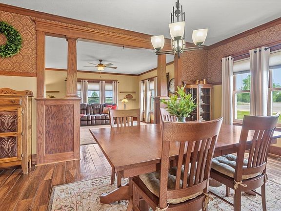 This classic farmhouse offers the perfect blend of charm and modern convenience. This gorgeous property has over 3 acres of land and a spacious 5 bedroom, 2 bathroom home with over 2000 finished square feet of living space. Entering the home you have a large entryway with heated floors, a dropzone, and a laundry room with a full bathroom. The main floor of the home has a large kitchen with ample cabinets and countertop space, beautiful wood floors, and built-ins throughout. Additionally, the main floor includes a large dining room, family room, and a versatile office/bedroom. Make sure not to overlook the stunning hardwood floors under the carpets in the second story, which features four bedrooms a full bathroom, and a walk-up attic for additional storage space. The attached garage comes equipped with heated floors. Additionally, the property features a 40 X 60 barn with running water and a half bathroom, a heated workshop with a bridge crane, and a chicken house. Schedule a showing today to take a look at all the amazing things this acreage has to offer.