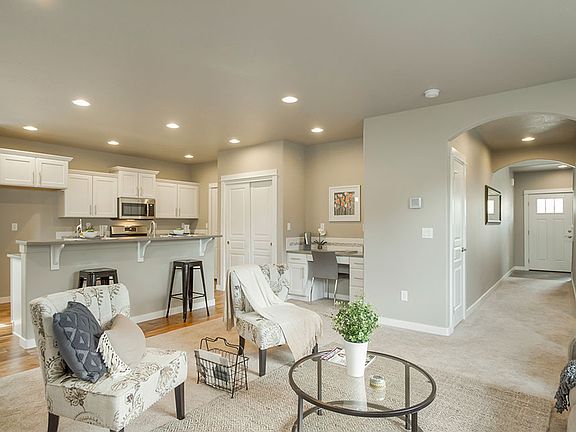 The 1743 square foot Middleton combines luxury and space in a two-story home plan. The first floor features an expansive living room and adjoining dining room, both overlooked by an open kitchen that offers ample counter space and cupboard storage with the added convenience of a built-in desk or beverage center. Upstairs, the extravagant master suite boasts a luxurious dual vanity bathroom with a private water closet and shower, as well as an enormous closet. The two other sizeable bedrooms, each with generous closet space, share a large private bathroom and complete this well rounded home. * Photos and floorplan are of a similar home. Upgrades and selections shown may vary. Contact Agent for specific details.