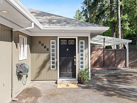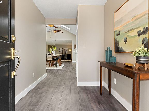 Located in the desirable West Slope neighborhood on a generous ½ acre corner lot surrounded by mature landscaping for privacy, this nicely updated residence offers one-level living featuring luxury vinyl plank flooring, recessed lighting, quartz and tile finishes, central air conditioning, and a newer water heater. A dedicated foyer with a coat closet opens to an expansive vaulted dining room with skylights and two ceiling fans. French doors from the room lead to a secluded covered patio perfect for dining al fresco and barbecuing this summer! The updated kitchen boasts freshly painted cabinets, new quartz counters with a tile backsplash and an opening overlooking the dining area. On the other side of the kitchen and dining room lies a large living room with a statement floor-to-ceiling brick wood-burning fireplace. The two bedrooms are located at the back of the home. The primary bedroom includes two closets, and the second bedroom is a versatile space with a Murphy bed, making it perfect for an office or bedroom. The hallway bathroom next to the bedrooms has been remodeled to include a floating stone-topped vanity, tile flooring, and a large tiled walk-in shower. A second full bathroom completes the interior with a new quartz counter, a laundry room with tons of cabinet storage, and a built-in desk for another office space option. A fully fenced yard space is ready for Fido, and a large circular driveway provides ample parking space with room for an RV.