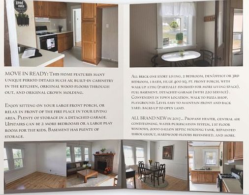 Well built brick Cape Cod with detached 1 car garage on a level lot. Just beautifully restored/improved! Living room brick fireplace with wood/coal stove, Dining room with shiny refinished hardwood floors, New Kitchen with table by wide window,convenient laundry/mudroom,3 bedrooms and full bath. Relax on large covered front porch. Second floor potential for a large 4th bedroom or playroom/office. Spacious unfinished basement, with workbench and lots of storage room. Recent improvements include new Central air,Propane gas heat,radon mitigation system, water purification system, 2000 gallon septic holding tank and entire inside was painted.Long driveway leads to garage and flat nice size yard. Don't rent when you can own this ready to move in sturdy home, where its all done for you! All furniture is negotiable.