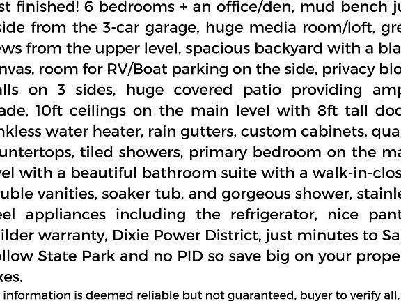 Just finished! 6 bedrooms + an office/den, mud bench just inside from the 3-car garage, huge media room/loft, great views from the upper level, spacious backyard with a blank canvas, room for RV/Boat parking on the side, privacy block walls on 3 sides, huge covered patio providing ample shade, 10ft ceilings on the main level with 8ft tall doors, tankless water heater, rain gutters, custom cabinets, quartz countertops, tiled showers, primary bedroom on the main level with a beautiful bathroom suite with a walk-in-closet, double vanities, soaker tub, and gorgeous shower, stainless steel appliances including the refrigerator, nice pantry, builder warranty, Dixie Power District, just minutes to Sand Hollow State Park and no PID so save big on your property taxes. All information is deemed reliable but not guaranteed, buyer to verify all.