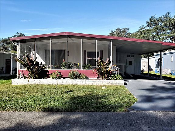 This home is located in a 55+ park lot rent is $643.80 going up in Feb. 2022 to $680.68. This home is sold unfurnished but a few things can stay. New roof over shingles-TPO, 7 new windows vinyl tilt out, new sub flooring in 5 areas, 2 new toilets, sinks and faucets, new linoleum in kitchen and bathrooms, driveway and porch painted, the whole interior painted, stones added next to driveway, new front door lock, 2 new parts in A/C (capacitor and fan motor) 4 point inspection done before roof was put on. Bed stays in the guest bedroom and antique dressers in master stay. The Florida room is 10x20 screened in and on the front of the home perfect to communicate with neighbors walking by or just sitting and enjoying our beautiful Florida weather. Living room is 11x19, carpeted and has a beachy theme open to dining room that has a built in hutch and sliders out to Florida room. Kitchen is 11x12 so cute with lots of upgrades.....new lower cabinets, new stove, countertops, sink and faucet. Master is 11x14 carpeted nice size closet Master bath is 11x6 with walk in closet also new toilet, sink and faucet Guest bedroom is 10x11 with long wall closet and bed stays Guest bathroom is 8x7 with new toilet, sink and faucet and large vanity Shed is 11x12 with sink. shelves and lots of work space. "All listing information is deemed reliable but not guaranteed and should be independently verified through personal inspection by appropriate professionals. American Mobile Home Sales of Tampa Bay, Inc. cannot guarantee or warrant the accuracy of this information or condition of this property. Measurements are approximate. The buyer assumes full responsibility for obtaining all current rates of lot rent, fees, or pass-on costs associated with the community, park, or home from the community/park manager. American Mobile Home Sales of Tampa Bay, Inc. is not responsible for quoting of said fees."
