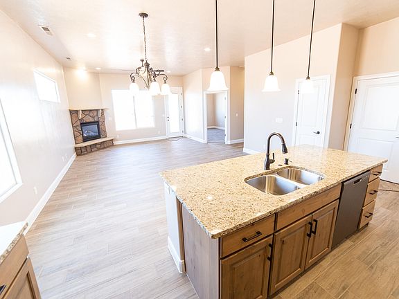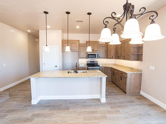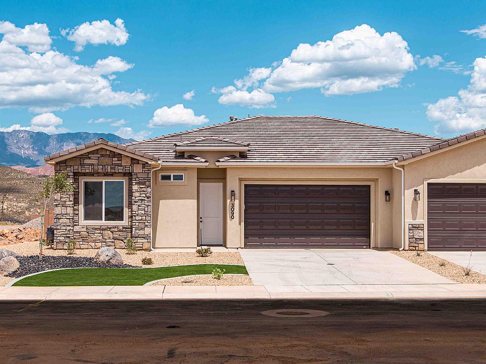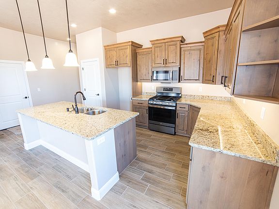 This single story townhome is the eastern half of a brand new duplex. This very open floorplan has 10' ceilings, wood grain tile floors, splendid views of the area's iconic geologic features such as fully tiled walk-in master shower, double sinks, garden tub, and walk-in closet in the primary suite. Cabinets are constructed of solid knotty alder and come equipped with soft-close hinges and under cabinet lighting for improved ambiance and visibility where you need it. Great room includes a gas fireplace and access to the backyard...which happens to be the absolute largest backyard in the subdivision! Backyard includes a gas firepit surrounded by flagstone for relaxing evenings outdoors. As for parking, this garage runs deep at nearly 24' with an extra bump out for shelves. Plus RV parking