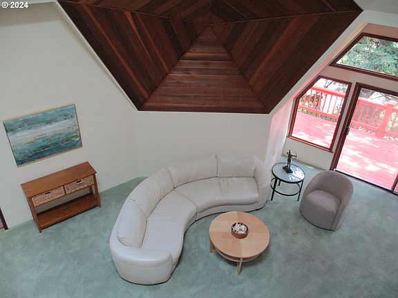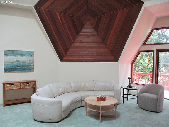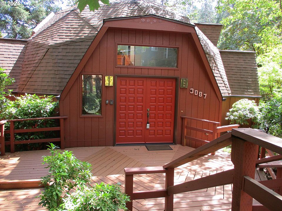 Classic Dome home nestled in the trees, originally the builder's own residence. Unique great room with wood inlays and and wood-burning fireplace, skylights, three levels for great separation of space, large indoor sauna, radiant floor heating, fireplace, hot tub on deck, patio area for outdoor living, backup propane generator, and located on two tax lots for extra privacy in the City.