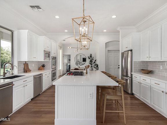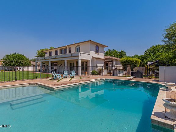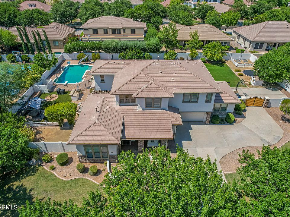 Now is your opportunity to live on one of the most sought after streets in Gilbert! This beautiful home sits on over 1/2 acre of hard to find land in north Gilbert. Space for everyone with 5 bedrooms plus den, 4.5 baths, 3 car garage and two storage rooms/workshops. Brand new exterior paint including wall paint, new professional refinished white cabinets, new quartz counters, new backsplash, two dishwashers, and butler pantry! Random lengths engineered wood floors, lots of crown moulding, and built-ins downstairs. Bedroom ensuite downstairs too. Additional en-suite upstairs and tow more bedrooms sharing jack-and-jill bathroom. Large master suite bedroom and remodeled bathroom with two closets, oversized shower, & freestanding tub. Massive grassy backyard with diving pool & built-in BBQ.