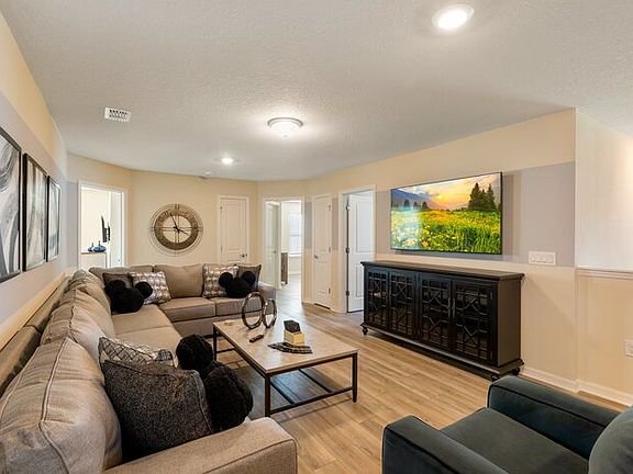 Living Room: Second lounge area boasts a large sectional sofa and another flatscreen TV for added relaxation. Open to the games room.