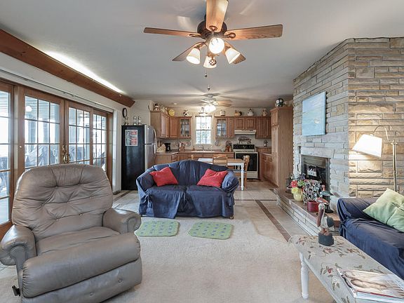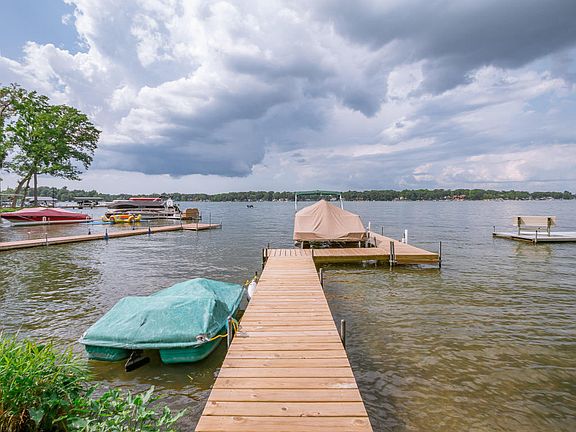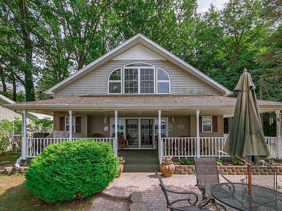 THIS CHARMING 5 BEDROOM HOME SITS ON A QUIET SEMI-PRIVATE ROAD ON 528 ACRE ALL SPORTS HIGHLY SOUGHT MAGICIAN LAKE. The open kitchen has tile floors, oak cabinets and views of the lake. The living room with it's large limestone, wood burning fireplace, leads out to a 35x10 wrap around covered porch where you can sit and relax, or you can step down & enjoy the sunshine on the 20x24 brick patio, or walk out to the sandy beach and pier. The upstairs features a large master bedroom with terrific views of the lake, and a tiled floor bathroom. The house is being sold turnkey & includes most furnishings and a new 2018 pier. There is also a 10x12 shed on the property.