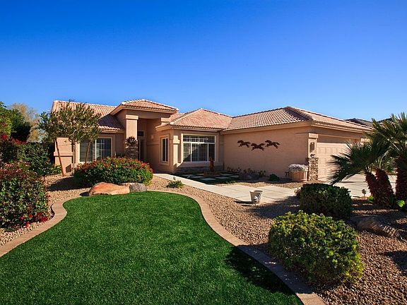 Well priced beautiful home located on an outstanding golf lot featuring expanded patio with pony walls, fire pit, built-in BBQ, water feature, lush refreshed landscaping with stunning outdoor lighting; perfect for entertaining. Floor plan expanded 2 ft on guest side of home making 2nd & 3rd bdrms and guest bath larger. Great Room has large windows to enjoy beautiful setting; master suite features bay window, 3/4 bath with dual sinks, and large walk-in closet; bay window also in guest bedroom; 3rd bedroom / den has built-in office cabinets. Kitchen highlighted by upgraded oak cabinets, Corian counters, sun-filled eating space. Laundry room with sink, extended garage with storage cabinets, attic access, & golf cart area. Ready for you to move in and enjoy the PebbleCreek resort lifestyle!
