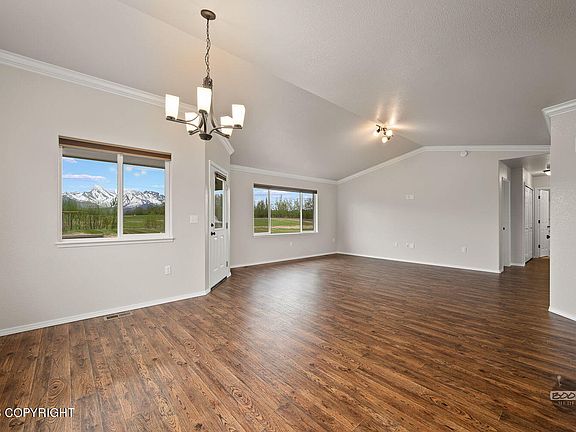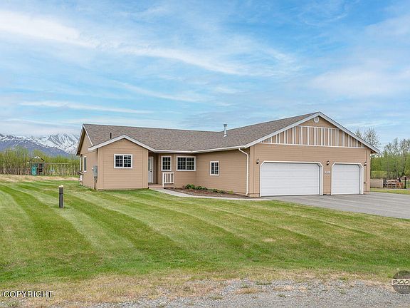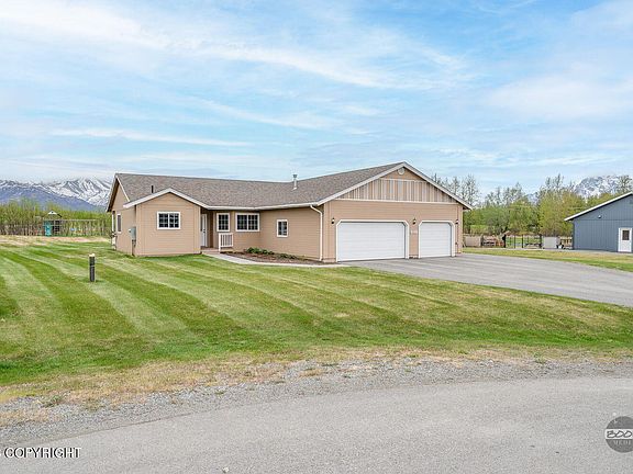 This exceptional ranch-style house boasts a spacious master suite, complete with a bay window, expansive walk-in closet, and a double vanity. The open-concept design enhances the spacious feel, particularly in the well-designed kitchen. An additional highlight is the three-car garage that offers ample space. Enjoy breath-taking views from this property, set on a flat, level lot, providing theperfect blend of openness and convenience. Additional features include 220-volt wiring in the garage, a generator switch, and a utility sink, perfecting its suitability for Alaskan living.