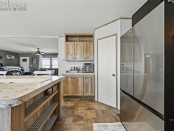 Property has a BRAND NEW ROOF!! Discover peaceful country living . This spacious 5 bedroom, 3 bathroom home offers over 2,000 square feet of thoughtfully designed living space on a featuring 40.39 acres of open, usable land, perfect for those seeking space, privacy, and versatility. Built in 2017, this traditional-style manufactured home features an open floor plan with a large living room complete with a cozy wood-burning fireplace. The kitchen is a cook’s dream, the open layout offers an oversized island, pantry, and a designated dining space, ideal for both everyday living and entertaining. The primary suite offers a luxurious five-piece bath and walk-in closet, while a convenient Jack-and-Jill bathroom serves two of the additional bedrooms. Vinyl and carpet flooring run throughout the home, and central air and forced air heating (propane) keep it comfortable year-round. Outside, enjoy mountain views from your private back deck. The land zoned A-35, making it suitable for horses and other rural uses. A wood storage shed provides additional utility space, and there's plenty of room to customize with outbuildings, gardens, or a small ranch operation. Located on a privately maintained dirt road, this property offers rural charm with easy access to Schriever Space Force Base and Peterson Space Force Base.