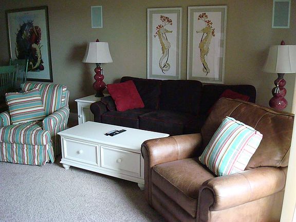 Lovely, livable townhome with garage/flexible room on bottom level, two bedrooms with ensuite baths and laundry on mid level., top level features open living/dining/kitchen areas with cathedral ceilings. Professional decorating features upscale beachy furniture and decor. The photos are similar to this unit with all tvs/electronics, gas fireplace, full kitchen setup included and minutes to a great Clubhouse/Pool/Gym!