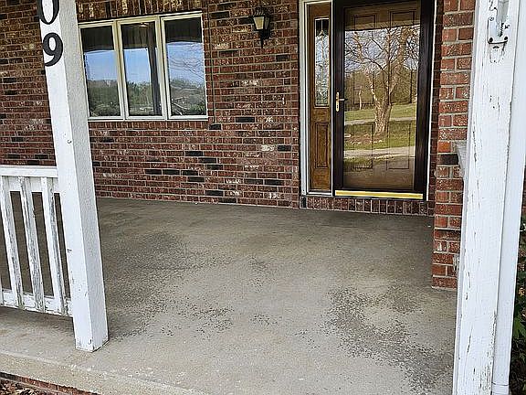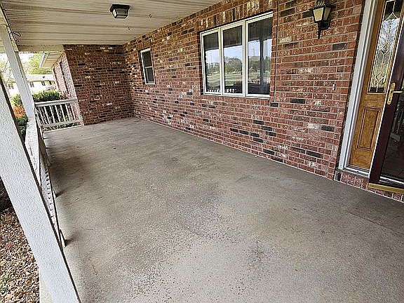 This large ranch home has an open concept features beautiful custom built oak shelves in the family room, a large kitchen with island, an office, 3 bedrooms and 3 full bathrooms, two large covered porches (front and back), an office and, a pantry. The brick home sits on a double lot and faces a field. It also comes with ample garage space in both and attached and an unattached garage. In addition, there is a half circle driveway in front of the home and another long driveway to the side of the home leading to both garages.