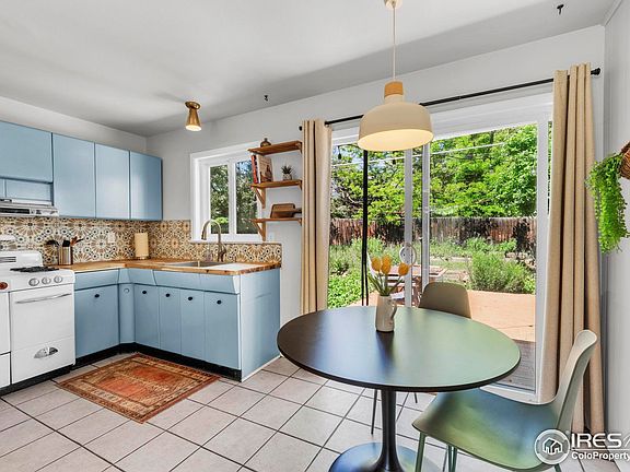 Enjoy Flatirons views from this Shabby Chic, sun-filled Martin Acres ranch with vintage charm and modern updates throughout. This 2-bedroom, 1-bath home features an open floor plan, hardwood floors, a cozy living room fireplace, and stylish retro touches including a Vintage Magic Chef stove/oven and a Unique Classic refrigerator. The beautifully updated kitchen offers butcher block counters, Zia tile backsplash, and a large stainless basin sink. Bonus spaces include an office with wood floors, a lofted sleeping area above the office, and a separate den with built-ins-perfect for work or guests. Step outside to a fully fenced backyard oasis with mature landscaping, garden boxes, a treehouse/playset, and a large deck with built-in benches, ideal for entertaining. The front porch with a hanging swing (it is excluded b/c it has personal importance), covered bike parking, and side entrance adds curb appeal and functionality. Recent upgrades include newer windows, light fixtures, ceiling fans, and an updated bathroom with subway tile, new vanity, and toilet. Evaporative cooler, irrigation system, front-loading washer/dryer, and ample storage in the garage/workshop space complete the package. Just blocks from trails, schools, and Chautauqua, and recently rented as for up to $4,000/m mid-term Airbnb.