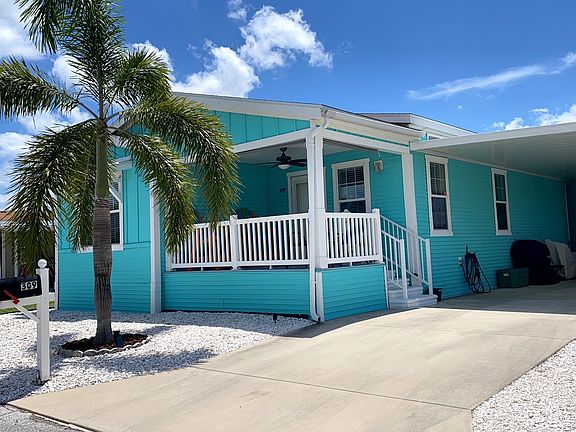 The first thing you will notice upon entering this home is the gorgeous luxury vinyl plank flooring throughout. This home is open concept with recess lighting, transom windows for natural light and beautiful finishes. The kitchen has several highlights including stainless steel appliances, more than the average amount of cabinetry, a high-top bar area with space for stools, tons of counter space including an area for a coffee bar or bakers bench, large pantry, low top desk area, pantry closet and a sunny dining area. The laundry area is conveniently tucked away in the dining area behind bifold doors with stackable front-loading washer/dryer. The large master bedroom with en-suite bath is located on one end of the home (away from the other two bedrooms) for privacy. It has a walk-in closet, dual vanities and a brand new gorgeous walk-in shower with a pull-down teak bench. The first guest room has a large double closet and plenty of room for whatever size bed you want. Second guest room is also a great size with a closet and is currently being used as a den. This would also make a great office or craft room! There is a spacious porch on the front of the home that could easily be screened in and has an overhead ceiling fan for those warm Florida days. There is also a large carport with an attached shed that is perfect for storage and even has room for a workshop. This is another possibility for a screened outdoor area! The lot rent is $954 and includes water, lawn care, sewer and trash, and all the amenities of the park. Colony Cove is a 55+ community with 5 clubhouses, 5 pools, a fitness room, library, game room, billiard room, pavilion and shuffleboard courts. Pet friendly offering a large dog park with views of the Manatee River. In addition, this park also has a private boat dock with fishing along with a marina with Gulf access. Close to restaurants and shopping areas making it convenient for seasonal and full-time residents. Please do not miss this opportunity, this could be your dream home! All listing information is deemed reliable but not guaranteed and should be independently verified through personal inspection by appropriate professionals. Integrity Mobile Home Sales cannot guarantee or warrant the accuracy of this information, measurements or condition of any property. Measurements are approximate. Lot rent subject to change.