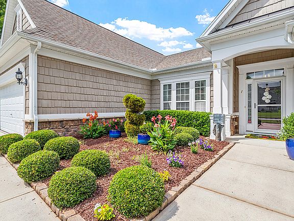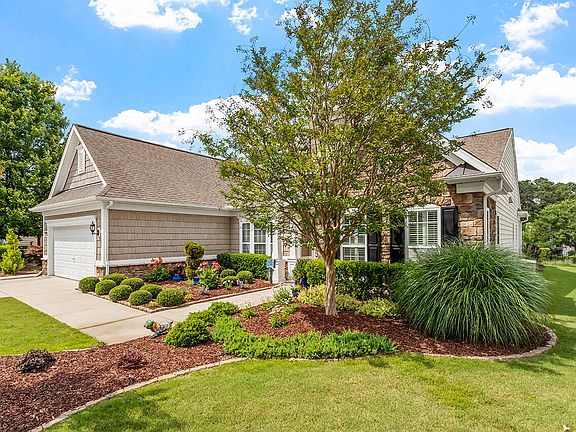 The stone front and exquisite landscaping welcome you to this gracious home located across the street from Carolina Preserve's largest park. Step inside to the casual but elegant design with upgraded light fixtures, NEWER AC, gas water heater, carpet & Bosch dishwasher. One-level living with 3 bedrooms/2 baths, sunroom, living room with fireplace, dining room, kitchen & office. Gleaming hardwood floors in the common areas. Kitchen with gas cooktop, breakfast bar, walk-in pantry, tiled backsplash, Zodiac counters, solar tube and slider pullouts. Custom window treatments, irrigation system and solar-powered attic fan. But wait till you see the back yard! With no houses directly behind the house, you can enjoy nature views from the extended tiled patio with partial roof. Make an appointment today to view this home in Cary's premier 55+ active adult community with resort-style amenities.