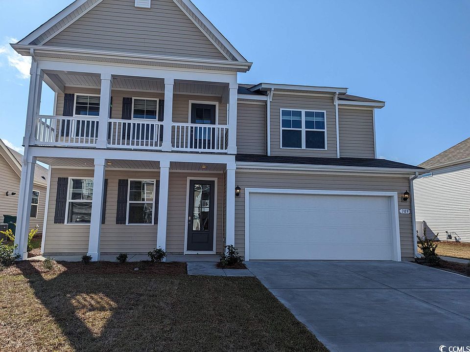 This popular plan brings functionality and style together! Incredible curb appeal is an understatement given the stacked front porches and tall entry door with glass. Once inside, wide plank laminate wood flooring creates an inviting space and numerous windows bring in fantastic natural light. Off the entry is a spacious flex room with French doors that would make a great home office or formal dining room. The large gourmet kitchen boasts 36" cabinetry, granite countertops, an oversized island, stainless Whirlpool appliances, a walk-in pantry, and a gorgeous Butler's pantry. Sliding glass doors off the dining area leads to the rear screen porch! Spacious bedroom and full bathroom on the first floor is perfect for guests visiting you at the beach. Upstairs you will find the grand primary bedroom suite with a cozy sitting room, huge walk-in closet that connects to the laundry room, and en suite bath with large separate vanities, linen closet, and 5 ft shower! This home is located in the new natural gas community in Carolina Forest! The Parks of Carolina Forest is a picturesque setting of ponds, an amazing amenity center, and park of the majestic "Ten Oaks" with a walking trail to get to the Carolina Forest library. *Photos and virtual tour are of a similar Harbor Oak floorplan. (Home and community information, including pricing, included features, terms, availability and amenities, are subject to change prior to sale at any time without notice or obligation. Square footages are approximate. Pictures, photographs, colors, features, and sizes are for illustration purposes only and will vary from the homes as built. Equal housing opportunity builder.)