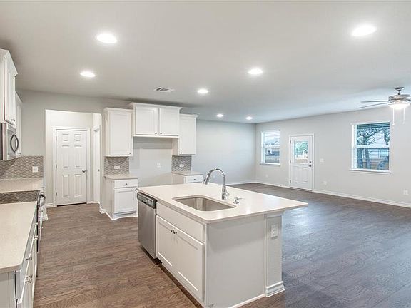 This open-concept, single story home features a gallery entry, two bedrooms and one bath at front hall and spacious private master suite. Master bath includes linen storage space, walk-in shower, double vanity, enclosed water closet and large walk-in closet. Kitchen and dining are open to Great Room, ideal for entertaining and family movie nights. Island includes Stainless Steel single-basin sink, dishwasher and additional seating space. Plentiful pantry shelving compliments substantial cabinet storage. Laundry conveniently located at garage entry.
