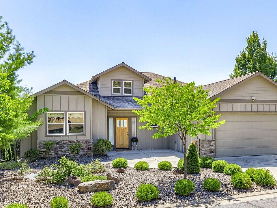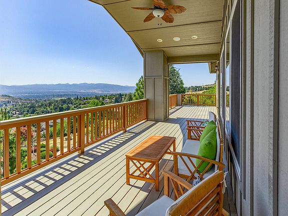 East hills home w/panoramic views across the valley! Open & spacious great room plan w/an abundance of natural light, vaulted ceilings, wood floors and gas fireplace w/tile hearth. Main level primary room features double vanity in the bath, large walk-out tile shower, jetted tub, walk-in closet & access to expansive covered wood decking. Open kitchen w/large peninsula, breakfast bar, all stainless appliances, double ovens, built-in microwave, electric cooktop & corner pantry. In-home office complete w/built-in desks & storage, guest bedroom and full bath on the main level. Lower level features a large family room w/wet bar and 2-additional guest bedrooms w/full bath. Slab Granite counters throughout, Travertine backsplash, built-in speaker system, central vac system, slate patios and low maintenance landscaping w/many outdoor areas for entertaining. You will enjoy this beautiful custom home w/fabulous city lights & mountain views located in the desirable Ridge at the Highlands!