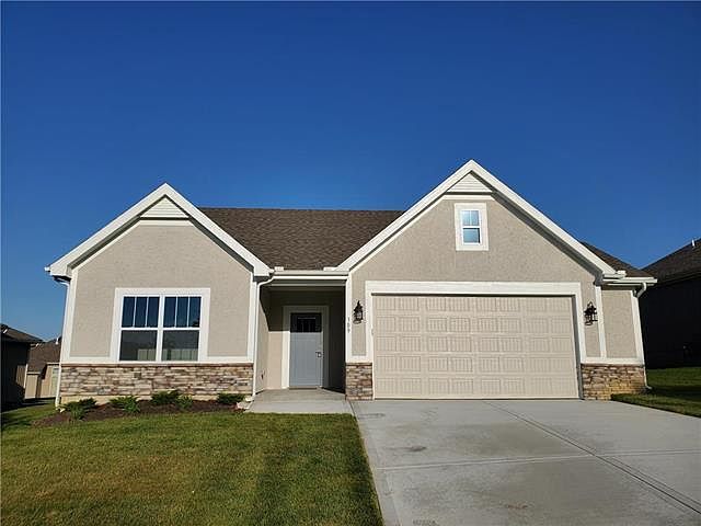 Beautiful ranch plan by Authentic Homes KC. Everything you need on one level, and upgrades galore! Main areas have luxury engineered flooring. Quartz counters in kitchen and both bathrooms. Kitchen has stainless appliances with gas stove/range, walk-in pantry. Master suite has large bedroom & bathroom with double vanity, custom tiled shower, and walk-in closet. Extra storage space in garage. Built-in storm shelter in the garage is also included.