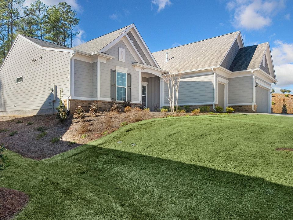 WELCOME HOME TO YOUR BRAND NEW, NEVER LIVED IN NAPA VALLEY HOME NESTLED IN ON A PRIVATE BEAUTIFUL LOT WITH WOODS AND GOLF COURSE BEHIND AND RAISED BERM ON THE RIGHT SIDE. This amazing home has 2 bedrooms and 2 baths and a garage with golf cart garage. The master bedroom en suite has a Tray ceiling and 2 piece crown molding and large walk- in closet with windows. The laundry room has cabinets, granite counter tops and folding table. As you enter the home you experience a bright spacious open feeling as your eyes gaze through the dining room to the right which seats 12 and is defined by columns, through to the Great room and gourmet kitchen which features an island bar for guests to sit and talk while you prep the items for a fabulous meal. This kitchen is designed with a gourmet kitchen which includes solid surface quartz counter tops, stainless steel appliances, staggered white cabinets, under cabinet lighting, counter top gas grill, wall oven and wall microwave. As you turn to the right you enter a breakfast nook which overlooks the covered porch for your morning coffee which flows into a cozy Hearth Room with a Fireplace. This is a perfect setting for quiet time to listen to music or read a book while you enjoy your favorite beverage. Off the Hearth room there is a large private study with double French doors at its entrance. This luxurious home also features crown molding in the main area of the home, gorgeous LVT flooring, tile floors, 4 foot extension in the garage, pull down stairs, irrigation system and upgraded light fixtures and fans with remotes. This home is a must see. You cannot build it today for this price. What is the most IMPORTANT reason to purchase in Del Webb at Sun City Peachtree? THE LIFESTYLE!!!! This Adult Golf Course Community is located about 40 minutes south of Atlanta and the Hartsfield Jackson International Airport. In addition to golfing there are over 200 activity clubs to join. The Clubhouse has a state of the art exercise facility, 2 pools indoor and outdoors, hot tub, Theater for shows and movies, Crafts room, billiard's room, dance studio, meeting rooms and ball room for large or small events. Do you like sports? You have come to the right place. We offer Pickle ball, Bocce Ball, Tennis, walking trails and a fantastic Softball field with bleachers. INCREDIBLE PRICE. REDUCED another $10,000!!!!! Seller is Motivated to sell.