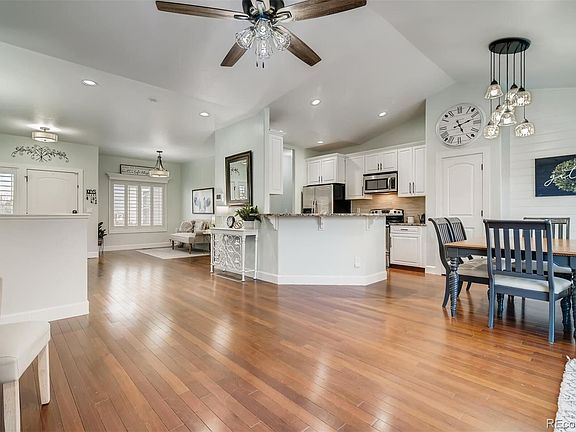 From the moment you walk through the door, youâEUR(tm)ll feel right at home in this charming property! With an inviting open floor plan, vaulted ceilings, and main-level living, this light and bright 4 bed, 3.5 bath south-facing ranch home is sure to please. Start with the gorgeous Brazilian hardwood floors leading to the updated kitchen with white cabinets, granite counters, stainless steel appliances, and pantry. Next to the kitchen youâEUR(tm)ll find an eat-in area showcasing a shiplap wall and stunning light fixture. The main floor master bedroom is separate from the other bedrooms and features a 5-piece en suite bathroom and walk-in closet. Between the other two bedrooms on the main level is a shared full bath with double sinks. Need more space Head down to the finished basement and get cozy around the pellet stove fireplace in the living area. The basement also has another bedroom with a walk-in closet and full bath, plus a storage area with shelving and a crawl space for even more storage! Enjoy the covered patio or sit around the fire pit in the fenced backyard. This home is also in a great location and convenient to just about everything, including I-25 about 4 miles away. Johnstown Center shopping center, restaurants, grocery store, new YMCA, parks, library, post office, and police station are all within walking distance! Plus, new roof with upgraded class 4 impact-resistant shingles being installed. Save $ on your homeownerâEUR(tm)s insurance! The home also has a radon mitigation system, fiber cement siding, and a water purification/softener combo. And in addition to all that, reasonable HOA dues are a bonus. This property is a must-see!