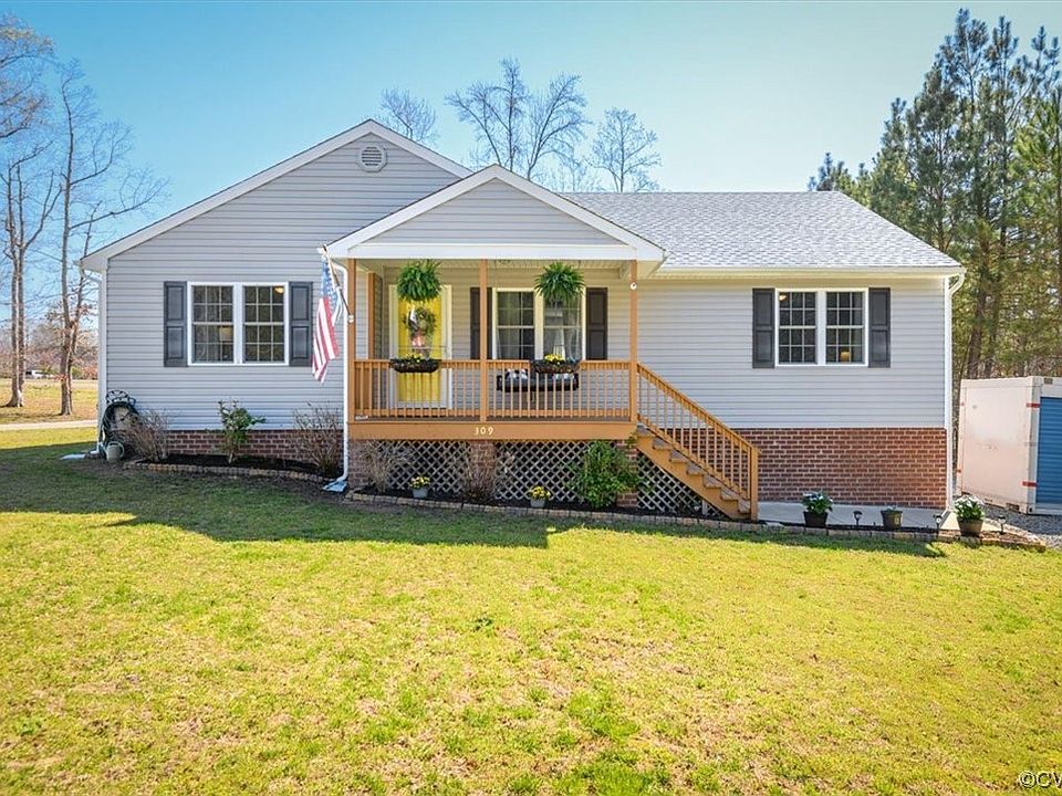 Your COUNTRY OASIS AWAITS in King William County. This beautiful 3 BDRM & 2 BATH home on a corner lot has everything you are looking for! From the 14X6 front porch w/a swing, to the 14X10 backyard deck, the 11X7 DET shed, a 24X12 DET 1-car garage, the fenced backyard w/a firepit & a fully encapsulated crawl space that spans the entire length & width of the home, there is storage space & entertaining space galore. Step in from the front porch to an open living RM w/cathedral ceiling, gas fireplace & the spacious eat-in kitchen w/plenty of wood cabinetry, tile backsplash, SS APPL, a large dining area & a laundry RM w/the 6X2 pantry. The primary BDRM offers a 7X5 walk-in closet & a 9X8 BATH w/toilet, single vanity & storage, 3X2 linen closet, tub & shower. On the opposite end of the home, enter through a barn door to find 2 more BDRMs, both w/7X2 closets, a 2X2 hall linen closet, & the shared 10X6 BATH w/a single vanity, toilet, 3X2 linen closet, tub & shower. 5G internet wired underground allows for home office capabilities. Located close to Zoar State Park, the King William REC Center, restaurants, dining & zoned for great schools. Are you ready for your happy new beginning?