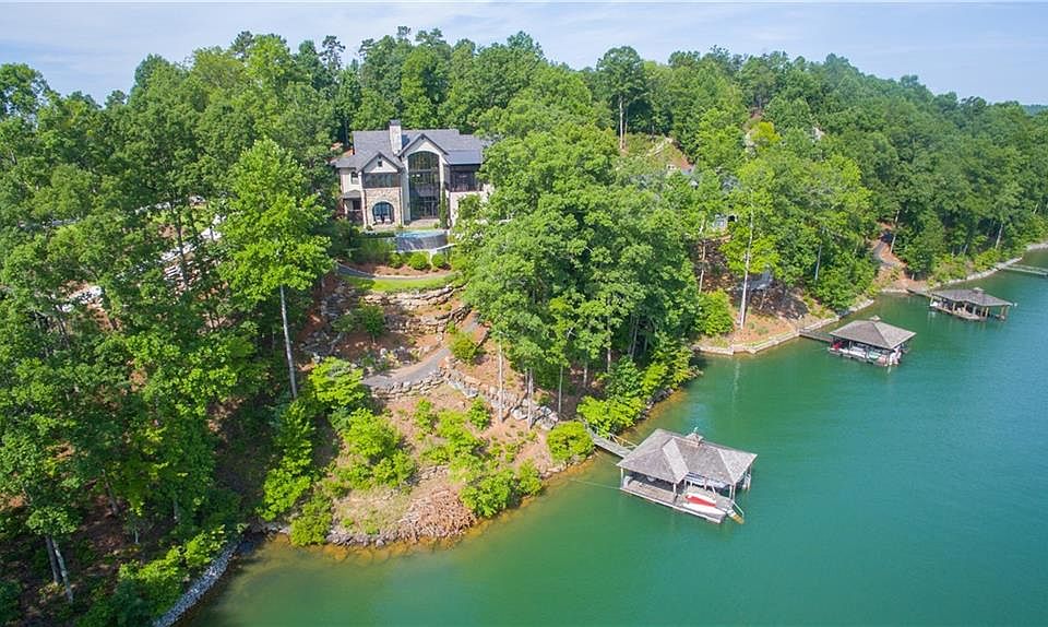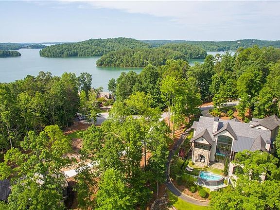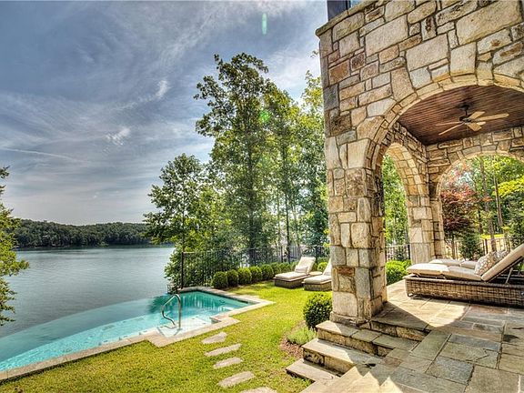 The search for perfect tranquility ends at 309 E. Fort George Way. Serene tones, natural elements, and mesmerizing views grace a waterfront retreat with open living areas and generous quarters for sharing with family and friends. At the rear of the home, an infinity pool that overlooks Lake Keowee offers both refreshment and the unique, captivating illusion in which no boundaries separate pool, lake, and sky. The home's exterior stylishly blends impressive stone arches, painted brick, stucco, timber accents, and slate roof. Inside, the foyer with barrel-vaulted ceiling introduces a great room with textured walls, heart pine flooring, and soaring windows that frame a majestic vista--a wide stretch of the lake backed by not-too-distant mountains. Liberal limestone, found on both the fireplace surround and the complementing kitchen range hood, lends relaxed elegance. The great room seamlessly flows to the dining area and kitchen ideal for entertaining. Well equipped with Wolf appliances, a farmhouse sink placed before a long row of windows, double dishwashers, wine cooler, and walk-in pantry, the kitchen incorporates two islands: one is topped with granite and includes a prep sink, while the larger provides hardwood counters and bar seating. Glass doors, which optionally fold to create an expansive opening, lead to the screened porch. The porch is anchored by a weighty stone fireplace and built-in grill, and spacious enough for comfortable seating and dining areas. A spiral staircase accesses the lower level. The main-level master bedroom invites repose with a limestone fireplace, vaulted plank ceiling, and generous window-lined sitting area that affords wonderful views. Vanities wrap around one end of the en-suite bath, also home to an airy chandelier, multi-head shower, and soaking tub backed by an arched, waterside window. On the lower level, the family/game room is trimmed with aged brick on the fireplace and opposite wall. Over the broad bar kitchenette, a decorative window peeks into the adjacent, medieval-inspired wine cellar (with over 1,000-bottle capacity). Three guest suites, each with individual ambience, are on the lower level. Two have outdoor access, and the third furnishes master accommodations with both a shower and soaking tub in its en suite. The oversized, two-car (there are two doors, but it's designed to stack so it can hold 3 cars) garage is connected to the main house via a short breezeway. Above the garage, an apartment indulges guests with a sitting room, kitchenette, and ample bedroom suite. Doors open to a lofty, lakeside Juliet balcony. Outdoor spaces comprise a lower-level terrace, infinity pool with lush lawn surround, outdoor shower room, paved cart path with parking area near the lake, and natural stone steps that descend to the shake-roofed boat dock. East Fort George Way is located in The Reserve at Lake Keowee, an amenity-rich golf community spread across some of Lake Keowee's most scenic terrain. Local towns, the city of Greenville, and Clemson University are minutes away.