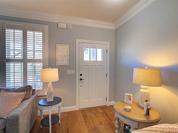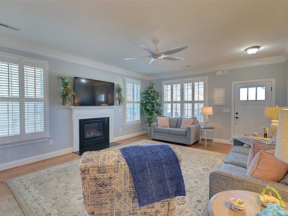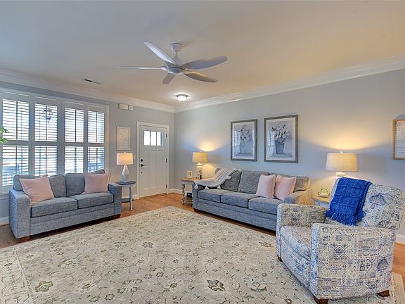 fresh and airy appearance of the home’s exterior. They will notice the large rocking chair front porch extending an invitation