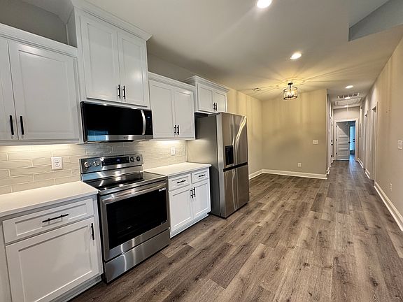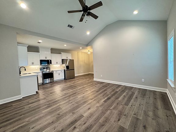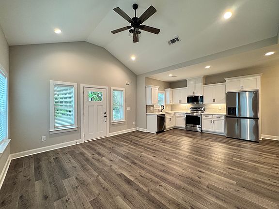 The airy, open floor plan features a spacious 14'9" x 15'8" living room with vaulted ceilings and durable LVP flooring throughout. The kitchen offers bright white cabinetry, sleek quartz countertops, and a full LG stainless steel appliance package. Enjoy meals in the 10'1" x 9'10" dining area, perfectly positioned for both everyday use and entertaining. The main bedroom includes a generous 6' x 4'10" closet, while all three bedrooms are equipped with ceiling fans for year-round comfort. The main bathroom is highlighted by a marble tile shower, and a second full bathroom adds convenience. A stackable laundry closet keeps chores simple, while spray foam insulation helps maintain efficiency in every season.