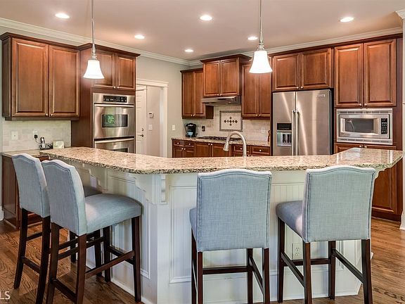 - Kitchen Features: Breakfast Bar, Cabinets Stain, Eat-in Kitchen, Pantry, View to Family Room, Kitchen Island, Breakfast Room, Solid Surface Counters