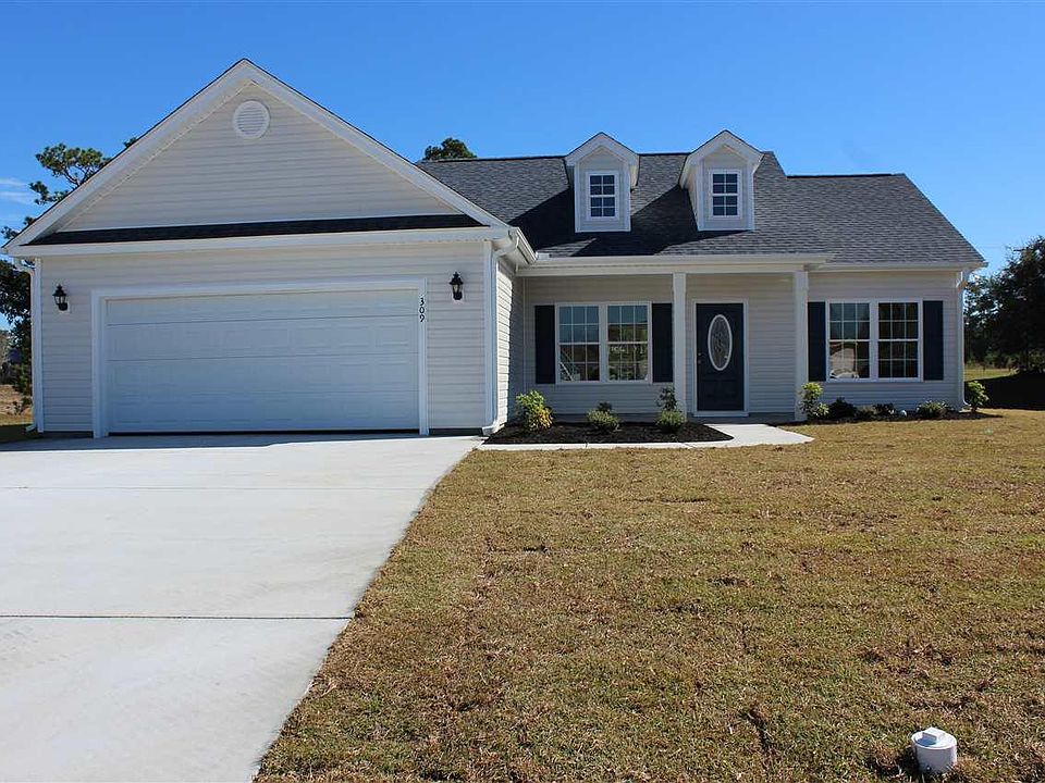 Popular Hickory 70, with open floor plan, split bedrooms, large relaxing front porch. Dining room has tray ceiling. Spacious kitchen has wrap around breakfast counter, breakfast nook, lots of counter top space and solid wood cabinets with crown molding and knobs, stainless steel appliances. Private 12' x 14' Master suite with vaulted ceiling, ceiling fan w/light, huge L shaped walk-in closet, two sinks, raised height vanity, garden tub with obscure privacy window to let light in, plus a separate walk-in shower. Rear screened porch and concrete patio. Smooth ceilings, 30 year roof shingles, cottage style doors, gutters, sodded yard with sprinkler system, fully finished 22' x 22' garage with automatic door opener, pull down stairs to attic storage. A country quiet community located within 20 minutes of N Myrtle Beach and the beach. Within minutes of downtown Loris, the Loris nature Park, Loris Community Hospital, and McLeod Family Health Center. Large home sites, lake and wooded views. Video is for illustrative purposes only and may be of similar home built elsewhere. Square footage is approximate and not guaranteed. Buyer is responsible for verification.