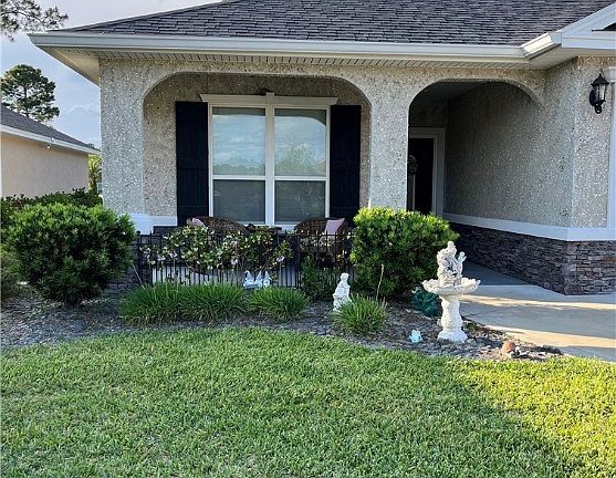 See what this inviting tabby with stacked stone home on Laurel Island is all about. This villa is a patio living at its best, built in 2016, and this is the first owner. It features a three-bedroom and two-bath floor plan and sits in front of fairway no. 17 at Laurel Island links golf course. Ceramic tile with a wood grain pattern makes for easy living. Bedrooms are all carpeted, and the baths have travertine tile floors. The split bedroom plan has two beds and a shared bath in front of the home in the primary bedroom suite in the back for privacy. The kitchen features, granite, countertops, counter-height, seating, and a terrific walk-in pantry to love. The homes storage area consist of walk-in closets, a two-car garage, and a pulldown Florida attic space. Peaceful enjoyment comes from the screened lanai to watch the golfers and sunsets at your leisure. A fenced in backyard with pastoral views of the golf course, gives you privacy and a possible place for your favorite pup. The owners have screened porch/lanai, added additional gutters, and replaced a microwave this year. With grass, cutting, edging, and leaf blowing as part of the issue a maintenance fees, you can enjoy puttering in your flowers, gardens, or maintaining shrubbery, depending on your desires. Irrigation is provided through a community well. This well-maintained home will not last long. Make an appointment with your agent today! Supra box available.