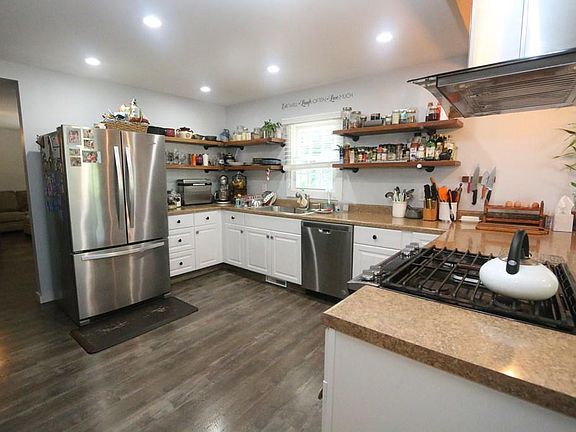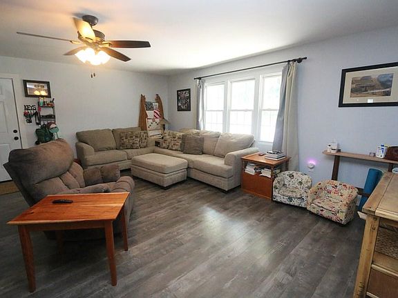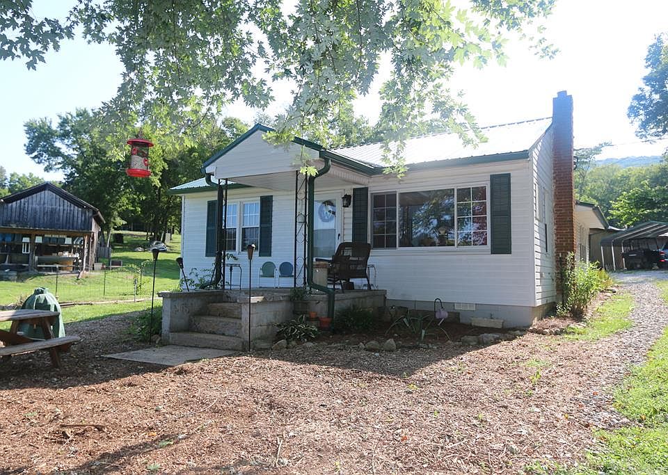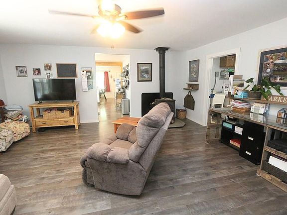 A remodeled home that resides on 5.5 unrestricted acres. Rolling hills with 2 barns and a shed on the property. The first barn was built with the old home place. There is underground power run into the property if you should decide to improve the 5.5 acres. There is a fenced garden area on the top of the hill. The soil has been amended and is great for veggies or flowers. The home has a kitchen and dining area that is open. Adjacent is the large living room. There is a chimney that owners used for a wood-burning stove. The current wood-burning stove does not convey.